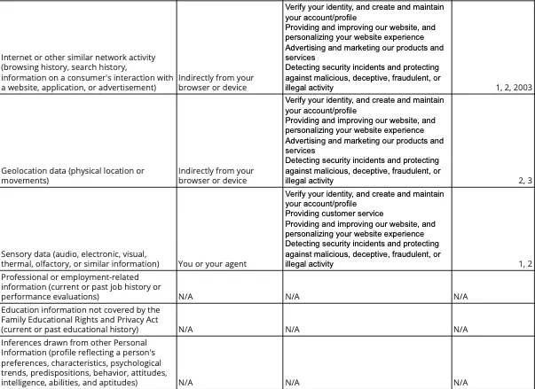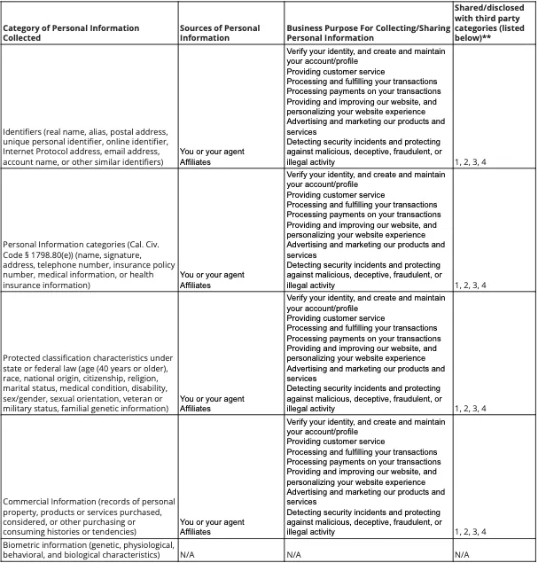 The chart below summarizes how we collect, use and share various categories of your Personal Information, indicating the sources from which we collect Personal Information, the business purposes for which Personal Information is collected and/or shared, and the categories of third parties with whom Personal Information is shared, describing our practices during the 12 months preceding the effective date of this Privacy Statement. We will not collect additional categories of Personal Information or use the Personal Information we collected for materially different, unrelated, or incompatible purposes without providing you notice and obtaining your consent where required by law.